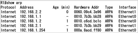 ※show ip arpコマンドでも同様の出力が得られます。show arpではAppleTalkなどのIP以外のプロトコルも含めたARPテーブル全体を表示し、show ip arpではIPプロトコルに関連するARPテーブルのみを表示します。