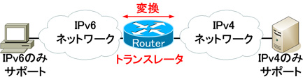 IPv6ネットワークとIPv4ネットワークの間でそれぞれの通信を取り持ち、変換する機能です。