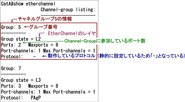 EtherChannelの設定状況は「show etherchannel」や「show etherchannel summary」で確認できます。