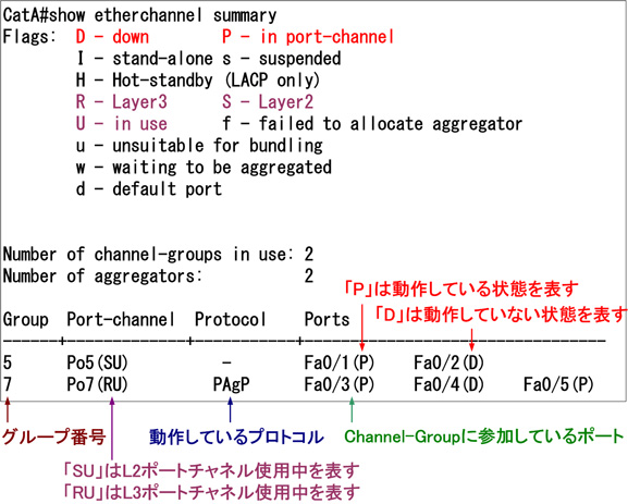 「show etherchannel summary」を使用すると、作成しているチャネルグループの状態や、使用しているプロトコルなどの簡易情報が表示されます。