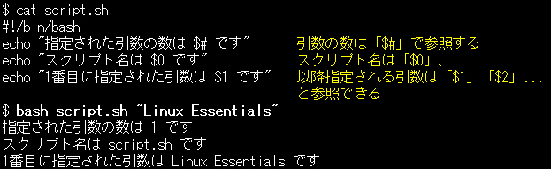 引数の数は「$#」、引数は先頭から「$1」「$2」などと参照できます。
