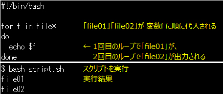 設問では、カレントディレクトリのファイルのうち「file*」、すなわち「file01」「file02」に対してループ処理をしています。