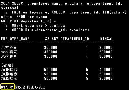 しかし、WHERE句には「e.salary > s.minsal」という検索条件しか指定されておらず、結合条件が欠けています。この場合エラーとはなりませんが、結合した全てのデータの組み合わせが返ってくるので正しい結果は得られません。
