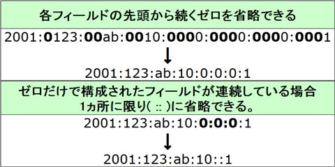 IPv6アドレスを全桁表記すると長くなるため、以下ルールにしたがって省略できます。