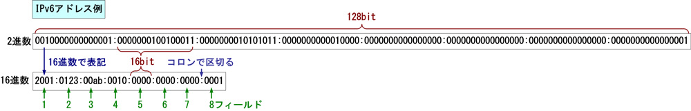 ・16進数(0-9とa-f)で表記し、全体128ビット(32桁)を16ビット(4桁)ずつコロン「:」で区切る(計8フィールド)