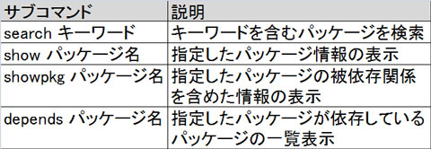 apt-cacheコマンドの書式および主なサブコマンドは以下のとおりです。