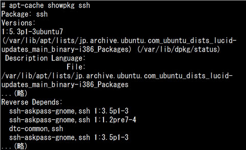 分かりやすい解説ありがとうございます。 sshパッケージ「が」=depends sshパッケージ「へ」=showpkg と覚えようと思います。ありがとうございます。