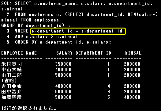 設問のSQL文ではEMPLOYEES表と、部署ごとの最低給与を問合せる( )で囲まれた副問合せをFROM句に指定し、両者を結合しています。
