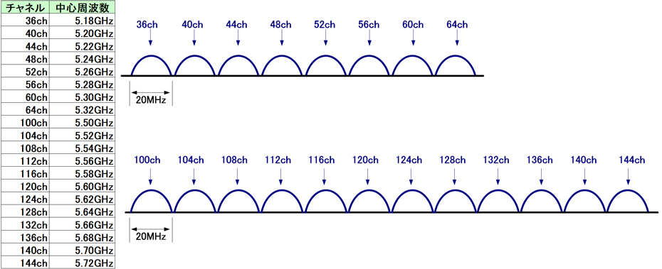 IEEE 802.11aでは5GHz帯を使用し、利用可能なチャネル数は20です。2.4GHz帯を使用する802.11b/gに比べてチャネル数が多く、チャネル間の重複もないためすべてのチャネルを同時利用できます。