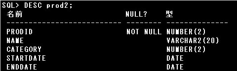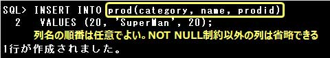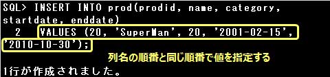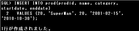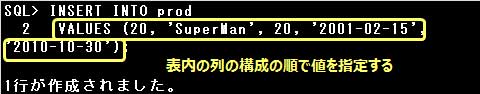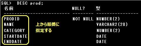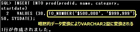INSERT INTO prod(prodid, name, category, startdate) VALUES (30, TO_NUMBER('$500,000', '$999,999'), 50, SYSDATE);は、name(VATCHAR2型)に対して、TO_NUMBER('$500,000', '$999,999') を追加しています。