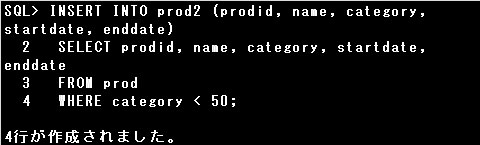 また、INSERT句の列のリストは省略可能ですが、省略する場合、副問合せのSELECT句の列のリストには、データを追加する表のすべての列を表の列構成の順番で指定しなければなりません(表の列構成はDESCコマンドで確認できます)。