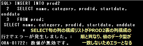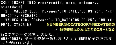 そのうち、TO_DATE関数の結果をCATEGORY列に登録するSQL文がありますが、CATEGORY列はNUMBER型の列であるため、DATE型の値を登録できません。そのためエラーとなります。
