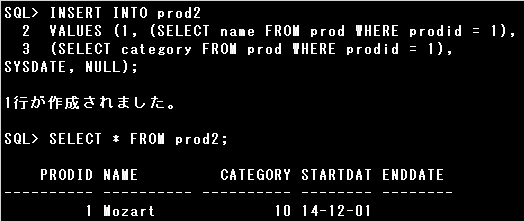 VALUES (1, (SELECT name FROM prod WHERE prodid = 1),