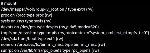 また、「デバイス」と「マウント先」どちらも指定しなかった(mount のみ実行した)場合は、現在マウントされているファイルシステムの一覧が、「/etc/mtab」ファイルの情報を元に表示されます。(マウント中のファイルシステムについては、下記「※マウント中のファイルシステムについて」もご参照ください。)