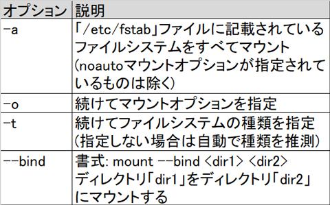 -o に続けて指定するマウントオプションとしては、「/etc/fstab」に記述するものと同じマウントオプションが利用できます。ファイルシステムの種類によって利用できるオプションが異なります。