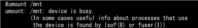 なお、ファイルシステムにあるファイルが操作中の場合や、ユーザがファイルシステム内で操作をしている場合、そのファイルシステムはアンマウントできません。
