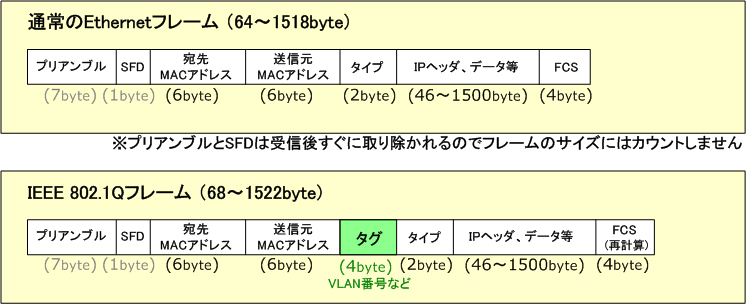 【図:通常のEthernetフレームとIEEE 802.1Qフレーム】