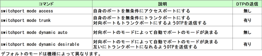 そのためトランクポートにする場合は、「switchport nonegotiate」でDTPを止めて「switchport mode trunk」で手動でトランクポートにすることが推奨されています。
