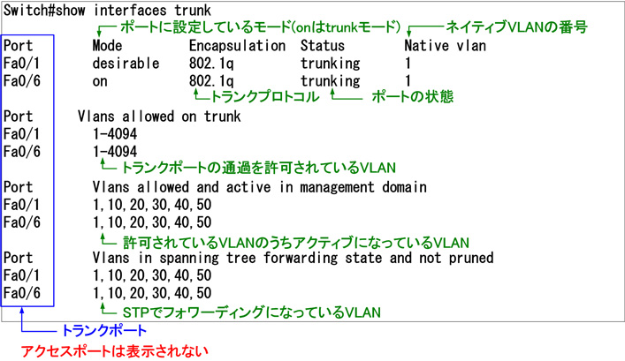 各コマンドの表示は以下のようになります。なお、いずれもFa0/1とFa0/6がトランクポートになっている場合の表示例です。