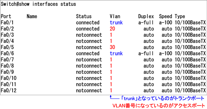 アクセスポートになっているのか、トランクポートになっているのかは「show vlan」「show interfaces trunk」「show interfaces status」「show interfaces switchport」などのコマンドで確認できます。