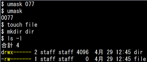 最初にumask値を設定してその確認を行い、その後、新規ファイルと新規ディレクトリを作成してそれらのパーミッションも確認しています。