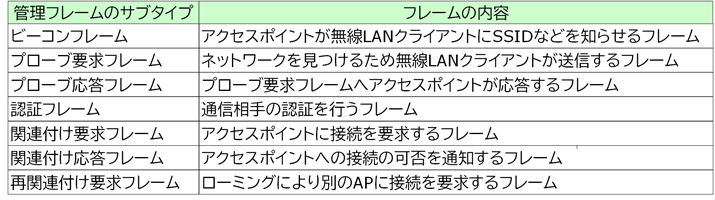 ・管理フレーム(認証、関連付け要求、関連付け応答、再関連付け要求など)