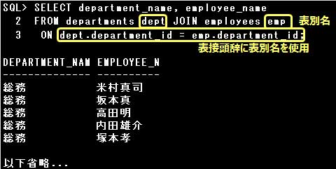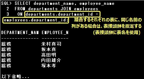 表の結合時、結合するそれぞれの表に同じ名前の列がある場合は、どの表の列であるかを明確にするために、列名に表接頭辞を指定しなければなりません。