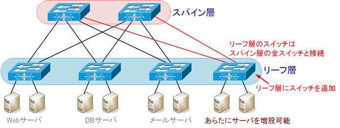 リーフ層にスイッチを追加することで、あらたな機能を追加したり既存の機能のサーバ数を増やすことができます。