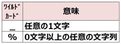 文字パターンには、任意の1文字と一致する「_」や、0文字以上の任意の文字列と一致する「%」といった、ワイルドカードを利用できます。