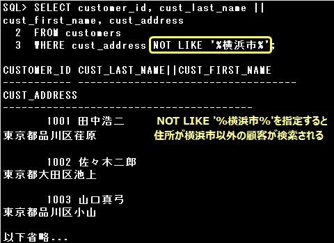 なお、文字パターンに一致しない行を検索する場合は、LIKE演算子とNOT演算子を組合せて次のように指定します。