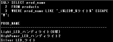 「WHERE prod_name LIKE 'i%LEDW%ライト%' ESCAPE 'W'」でLIKE演算子にESCAPEがあった場合、