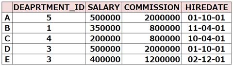 SELECT department_id, employee_id, employee_name, salary, commission, hiredate