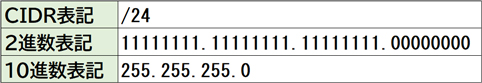 CIDR表記の場合はネットワーク部のビット数を「/」の後に書きます。