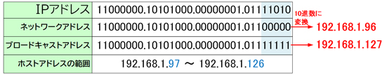 ネットワークアドレスは、ホスト部が2進数で全て「0」になるアドレスなので「192.168.1.96」になります。