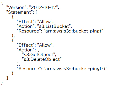 オブジェクトの取得および削除を行う という条件は、バケット「bucket-pingt/*」に対する「GetObject」「DeleteObject」を許可します。