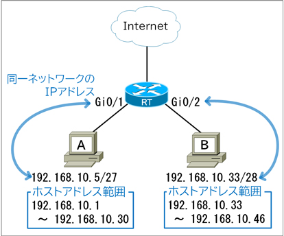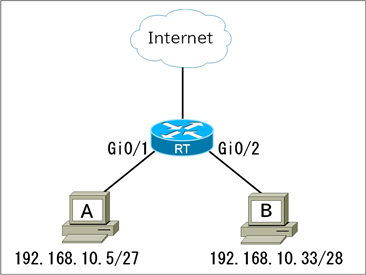 したがって、RTのGi0/1は、PCA「192.168.10.5/27」と同じネットワークに属するIPアドレスである必要があります。