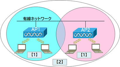 【1】のように単一のAPと無線LANクライアントで構成するネットワークを「BSS(Basic Service Set)」といい、【2】のように複数のBSSで構成するネットワークを「ESS(Extended Service Set)」といいます。