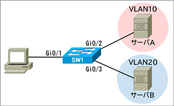 よって、PCからのパケットはVLAN10の通信として扱われるので、サーバAとは通信が可能です。異なるVLAN(VLAN20)に属するサーバBとは通信を行うことはできません。