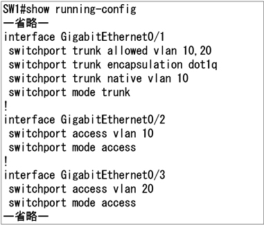 アクセスポートになっているのか、トランクポートになっているのかは「show vlan」「show interfaces trunk」「show interfaces status」「show interfaces switchport」などのコマンドで確認できます。