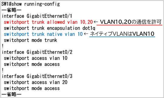 ネイティブVLANは「switchport trunk native vlan {VLAN番号}」コマンドで変更できます。変更していないデフォルトの状態ではVLAN1がネイティブVLANになっています。