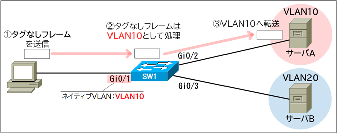 IEEE 802.1Qでは通常、フレームにタグを付けて送信しますがネイティブVLANにはタグを付けません。そのため、受信したフレームにタグが付いていない場合はネイティブVLANと判断できます。