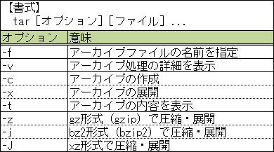複数のファイルをまとめてアーカイブファイルを作成するにはtarコマンドを使用します。以下はtarコマンドの書式と主なオプションです。