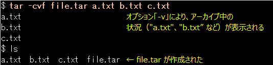例)ファイル「a.txt」「b.txt」「c.txt」をまとめてアーカイブファイル「file.tar」を作成する