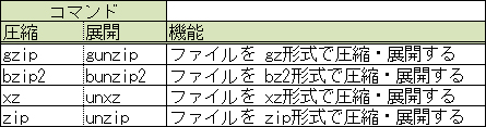 なお展開とは、圧縮されたデータを元に戻すことをいいます。展開するにはファイルの圧縮形式(どのように圧縮されたか)がわからなくては元に戻すことができません。そのため、通常はファイルの圧縮コマンドと展開コマンドは対になっています(下部のコマンド一覧参照)。