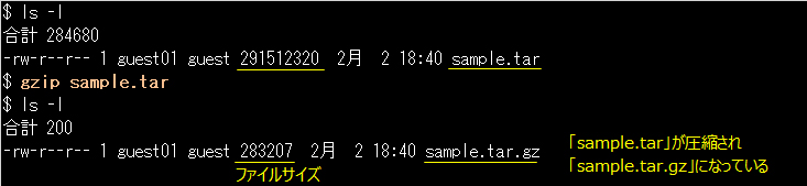 例)カレントディレクトリのファイル「sample.tar」を圧縮する