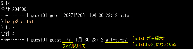 例)bz2形式の圧縮ファイル「a.txt.bz2」を展開する