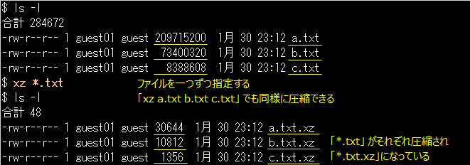 例)カレントディレクトリのファイル「a.txt」「b.txt」「c.txt」を圧縮する
