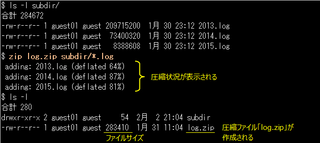 例)「subdir」ディレクトリの「.log」をまとめて1つのファイル「log.zip」を作成する