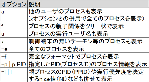 上表より、aオプションは他ユーザのプロセスも表示し、さらにxオプションは制御端末のないデーモン等のプロセスも表示しますので、