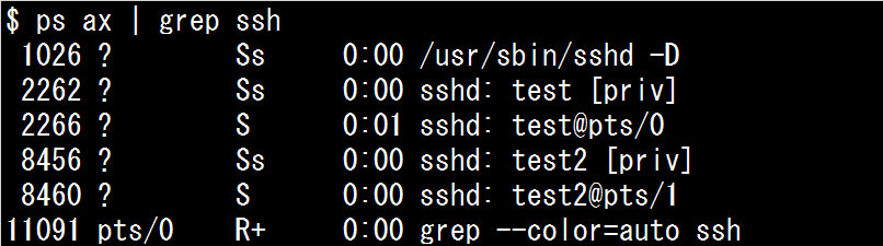 以下2例のプロセスIDを比較すると、pgrepの実行例の結果には「検索のために実行したコマンド」は含まれていないことが確認できます。